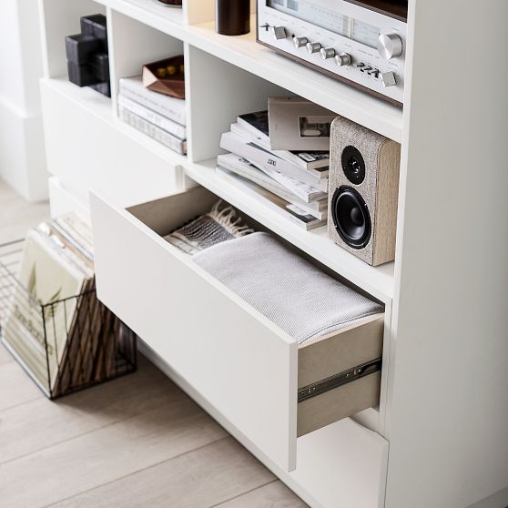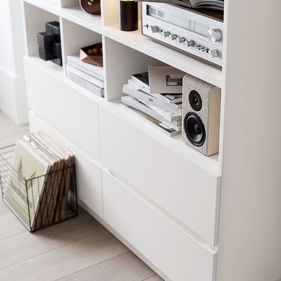 - Includes 4 roomy dresser drawers with a fixed grid of 9 open shelves above.