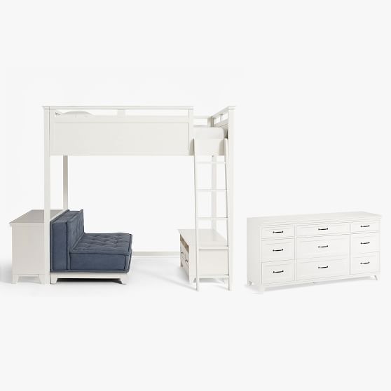 - This loft bed set includes the loft bed, bookcase, media base and cushy loveseat.