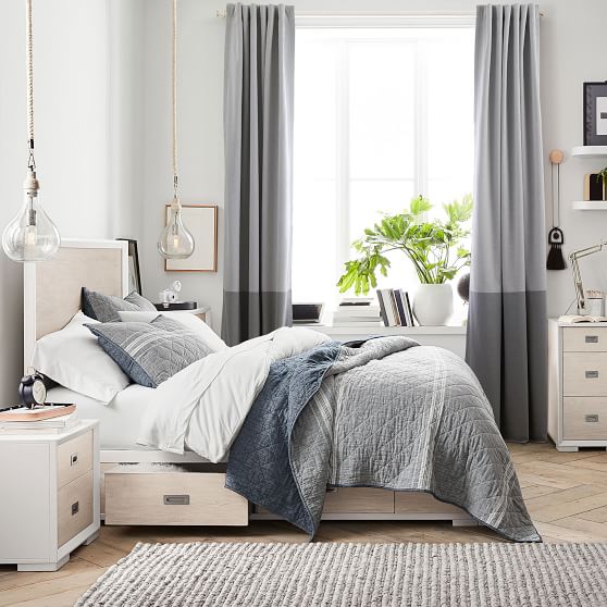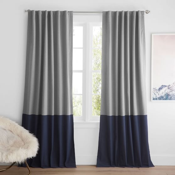 Crisp color blocks cover your window in modern style. Tailored from soft, recycled cotton, the drapes have a blackout lining so you can filter out light and sound while you snooze.