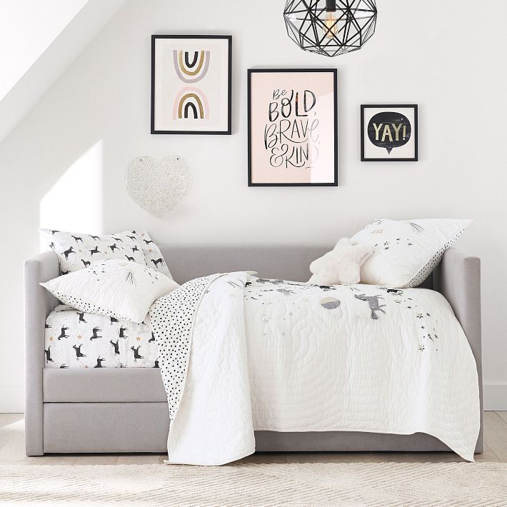 Simple, modern and versatile, the Carter Square Daybed features clean lines along with plush, padded comfort. The wraparound back and arms shelter a deep seat with a roll-out trundle below, which is great for storage or as a guest bed when you add our trundle mattress (sold separately). Masterfully crafted for enduring quality and style, the daybed features a sustainable-wood frame, hand-applied finishes and expertly tailored upholstery.
