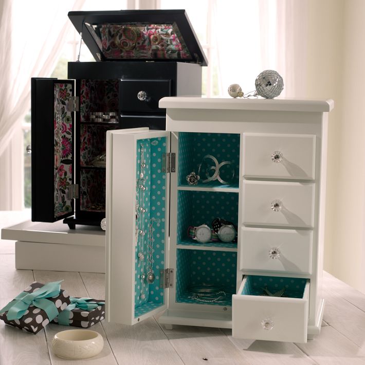 A colorful fabric interior adds a touch of fun to this classic jewelry organizer. Add a name on top for a really unique gift.