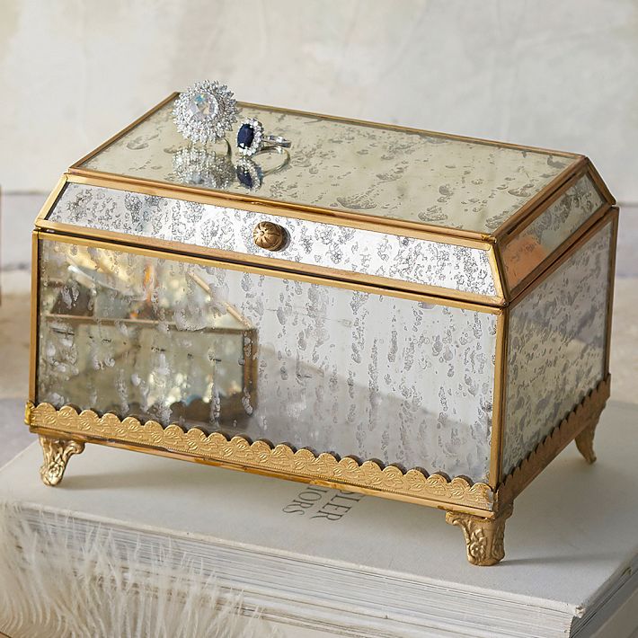 Shine on! This jewelry box provides a polished place to store your jewelry. Framed in brass and accented by antiqued mirrors, this chest makes organization oh-so-glamorous. Each piece is antiqued by hand, giving it a special, one-of-a-kind finish.
