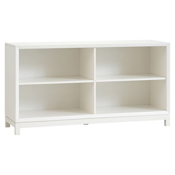 This low bookcase provides their room with clean lines and sturdy storage. With adjustable shelves, it creates space for books and keepsakes, bins and baskets.