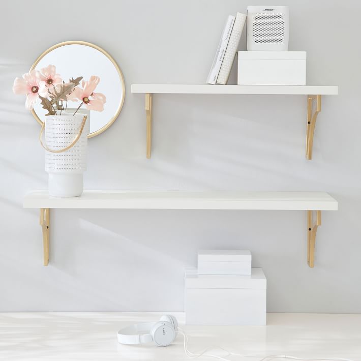 Scalloped golden brackets lend graceful support to our classic wooden wall shelves. Great for displaying books, artwork and your favorite keepsakes, the shelves are crafted with lasting quality.