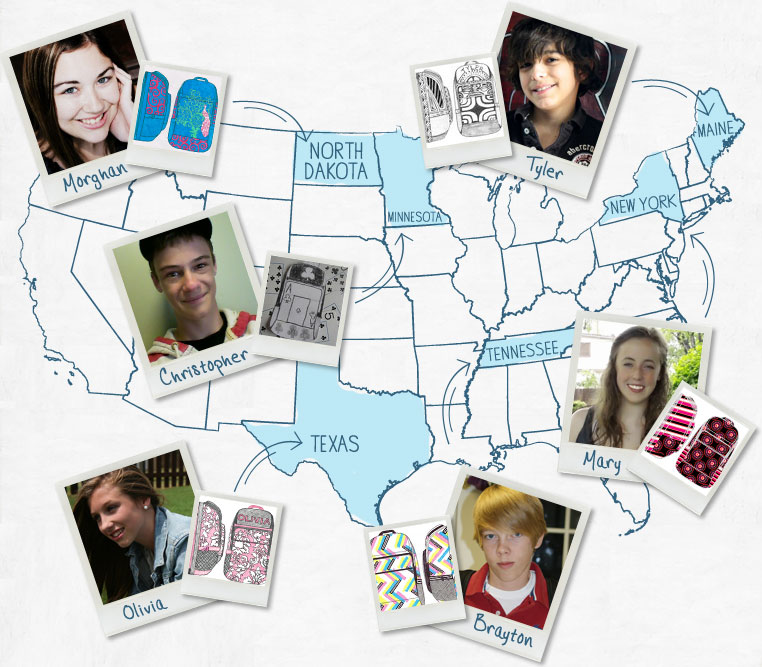We're so excited to announce the winners of our Backpack Contest: Congratulations to Morghan, Mary, Brayton, Tyler, Chris and Olivia! This contest was all about featuring real designs created by our fans, and we were blown away by all the creative entries we received. Pottery Barn Teen Facebook fans downloaded a template and created their own unique backpack designs, which our Design Panel — along with fellow fans — voted on to choose four winners to be included in our 2011 Gear Collection. With so many stylish and talented fans, the decision wasn't easy — and we loved six designs so much that we decided to add them all to our special collection! Winners received a $150 Pottery Barn Teen Gift Card, plus a backpack featuring their very own design.